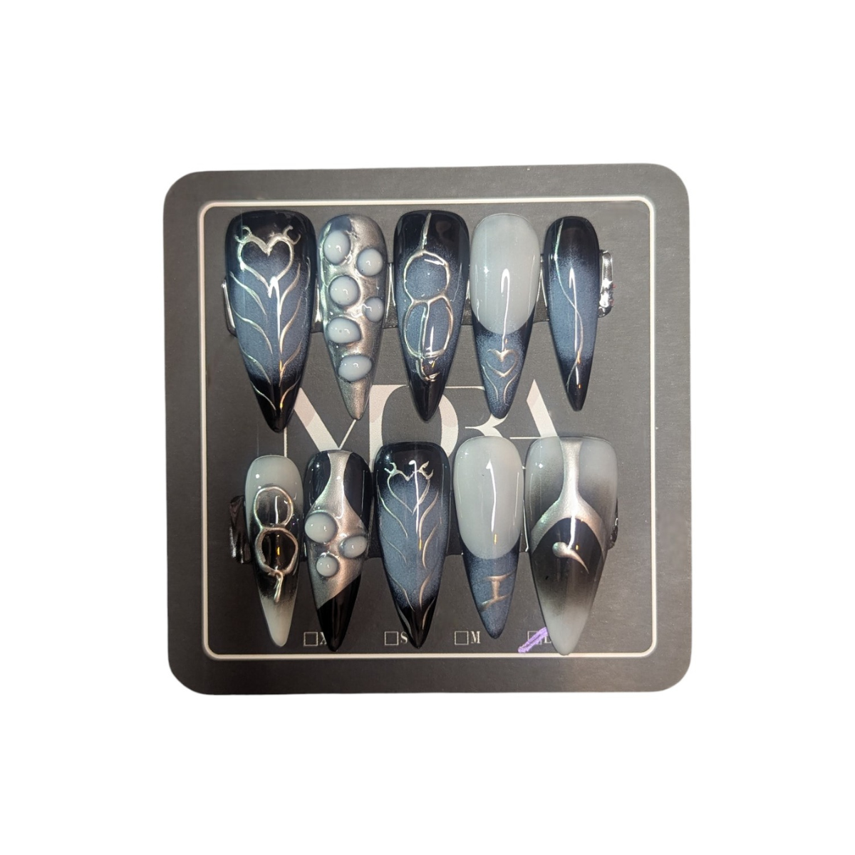 Ανακαλύψτε την απόλυτη πολυτέλεια στα νύχια με το σετ ''Midnight Eclipse''. Ένα μοναδικό χειροποίητο σχέδιο, εμπνευσμένο από τη μυστικότητα της νύχτας και τη λάμψη του φεγγαριού. Το βαθύ μαύρο συνδυάζεται αρμονικά με το γκρι και τις μεταλλικές λεπτομέρειες, δημιουργώντας ένα εντυπωσιακό αποτέλεσμα που τραβά όλα τα βλέμματα.